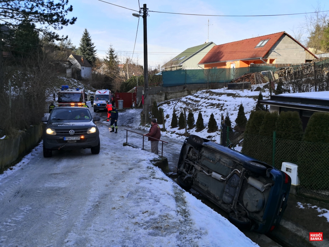 Dňa 21. januára o 10.45 nám obyvatelia nahlásili prevrátené vozidlo vo Vápeníckom potoku. Po príchode na miesto udalosti bolo zistené, že osobný automobil Škoda Felicia s EČV PN *** ** leží prevrátené naboku v koryte miestneho potoka. V čase nášho príchodu príslušníci HaZZ Piešťany už boli na mieste a vykonávali záchranné a zabezpečovacie práce. 2 osoby, ktoré boli vo vozidle, už boli v rukách Záchrannej zdravotnej služby. Boli vyšetrené, k zraneniam nedošlo. Jednotka DHZo Banka spolupracovala pri zabezpečení prejazdnosti miestnej komunikácie a následne pri vyprostení havarovaného vozidla z potoka. Únik prevádzkových kvapalín nebol zistený. Zasahovalo družstvo 1 + 3. Návrat na základňu o 13.10 hod.