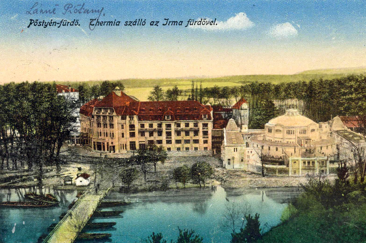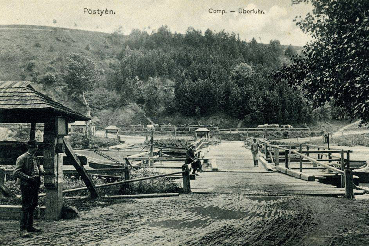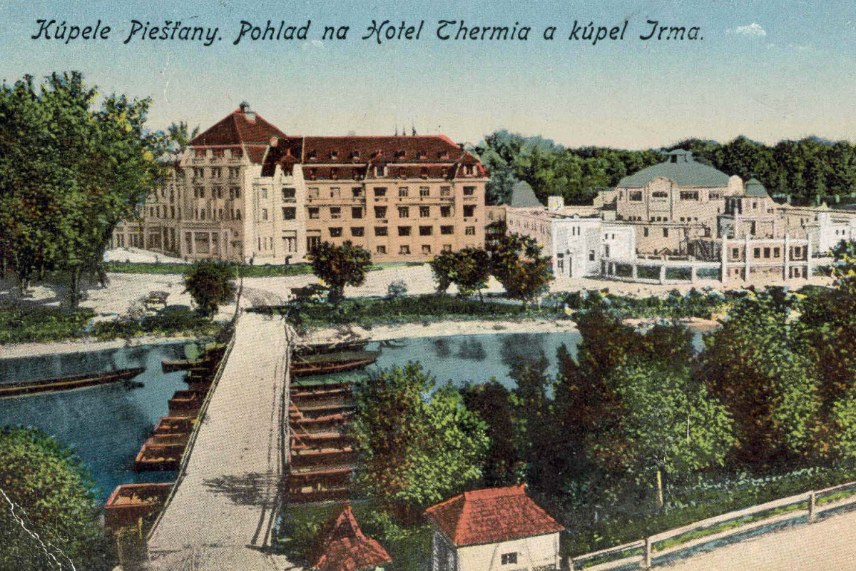 Pohľad na pontónový most a hotel Thermia Palace z Červenej veže