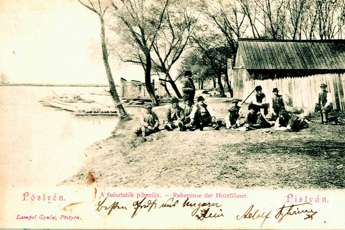 Oddychujúca skupina mužov, ktorí splavovali drevo na pltiach